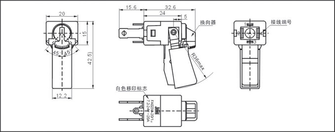 Product description >>Dust protected >>Reversing commutation function(K) >>Emergent stop equipment(B) >>Middle-locking device >>The battery hook can be mated Technical data >>Electric parameter: FA023A-20/1 7.2V-24VDC 20A 5E4 >>Mechanical life:1E5 >>Electric life:5E4 | |